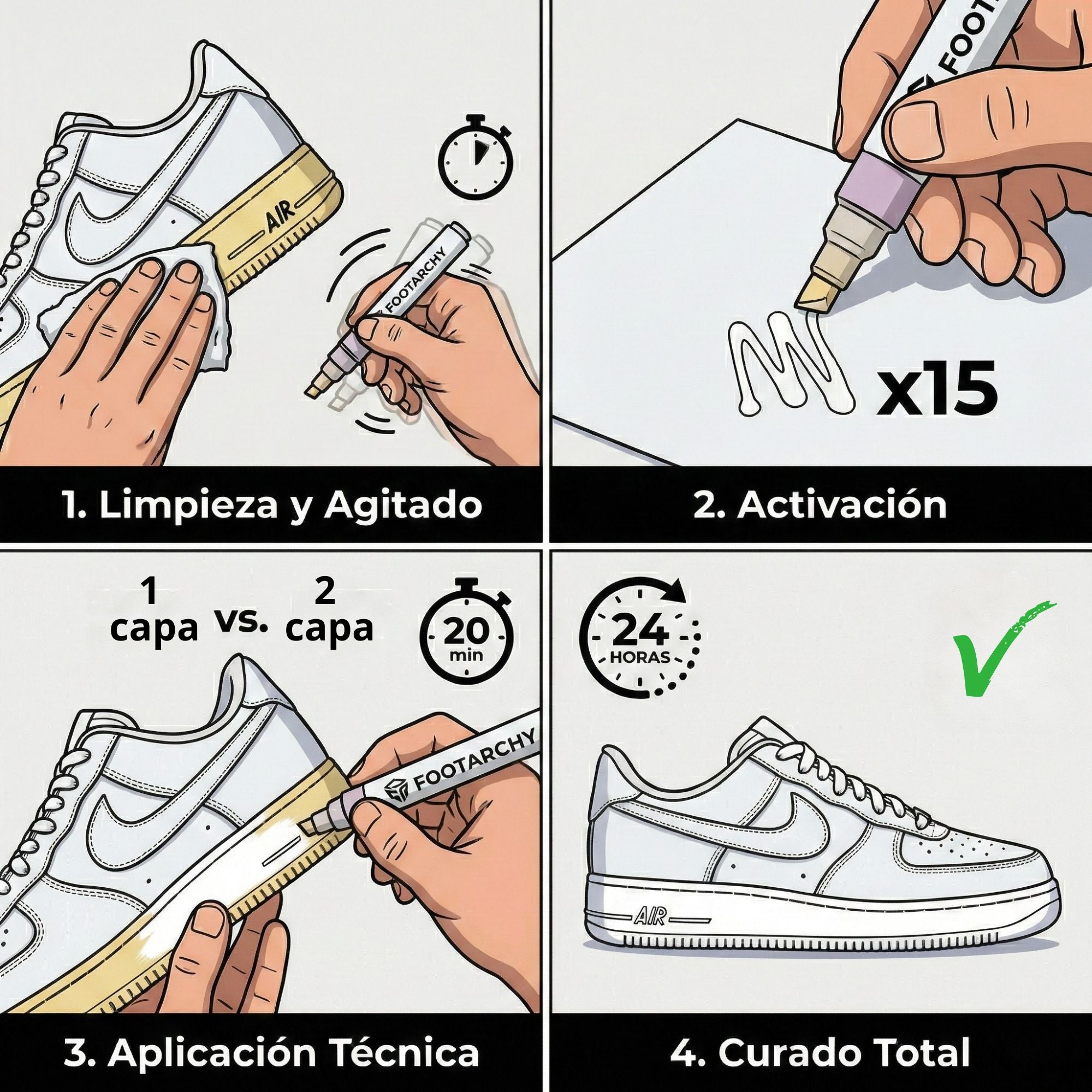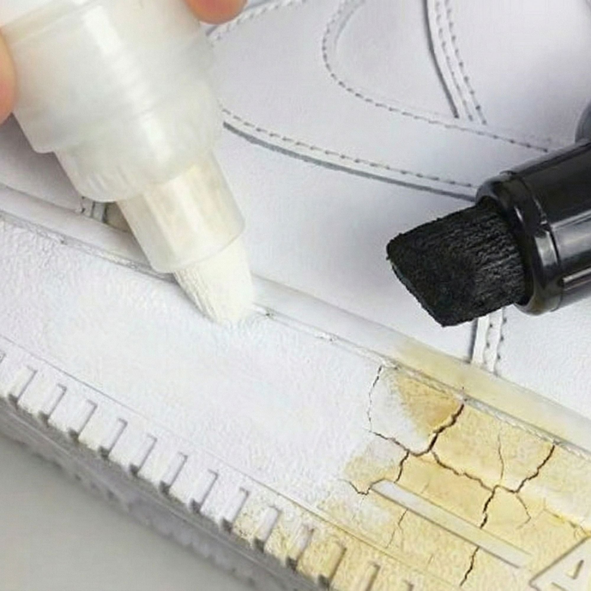 El amarilleo por oxidación y las rozaduras profundas son inevitables, haciendo que tus zapatillas exclusivas parezcan descuidadas. Nuestra fórmula profesional de base acuosa (72% agua) devuelve el blanco mate original sin usar químicos agresivos e inflamables. Pasa del desgaste al estreno inmediato con un acabado permanente y resistente al agua.